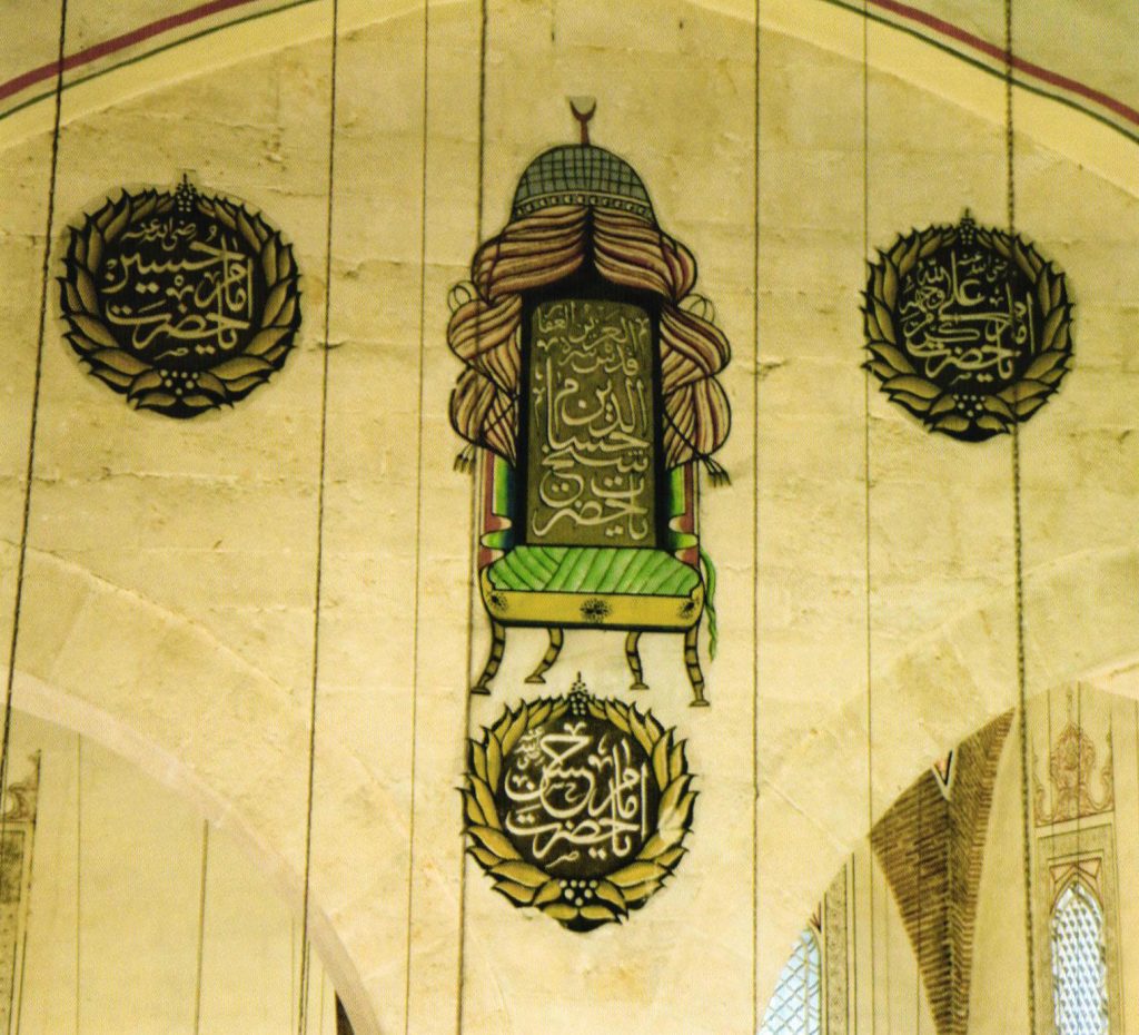 Kubbe geçişlerindeki dört pandantifte kırmızı zemin üzerine beyaz renkte müsennâ (aynalı) biçimde istif edilmiş, celî sülüs hattı ile Allah, Muhammed, Ebû Bekir, Ömer, Osman, Ali isimleri yer almaktadır.